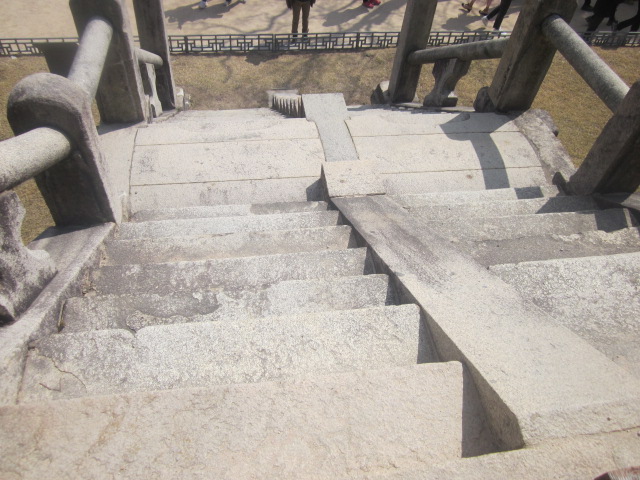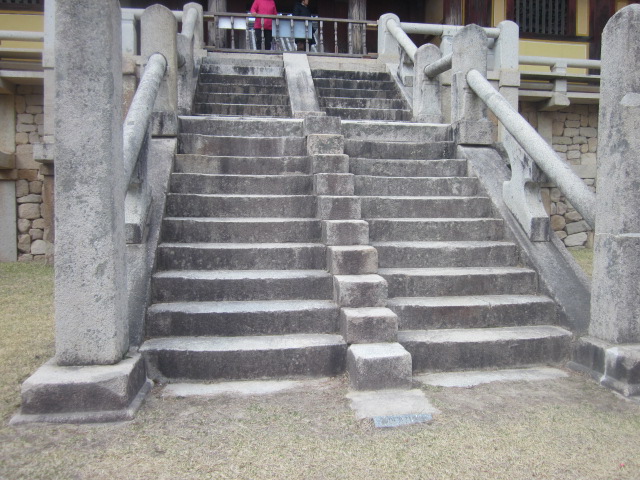 仏国寺には全部で6つの国宝がありますが、ここもその一つで、隣にある青雲橋・白雲橋と共に、創建当時の建造物として大切にされていて、現在は通常の観光客は立ち入り禁止となっています。段数が少ない(8段と10段)ので、青雲橋・白雲橋(16段・18段)と比較すると迫力には欠ける印象ですが、国宝の指定番号としては微妙にこちらの方が先(22号・青雲橋・白雲橋は23号)です。