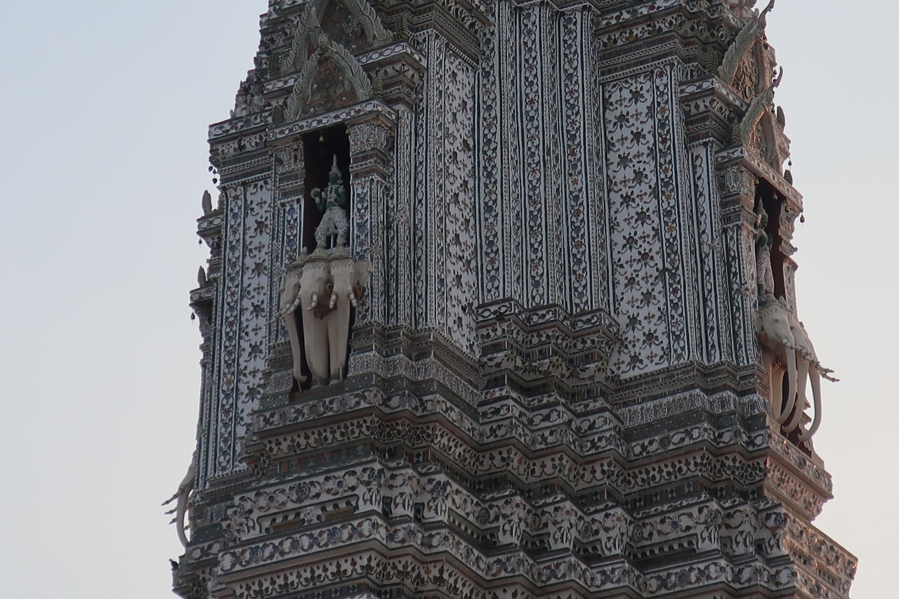 3つの頭がある象にまたがっていらっしゃる神様ですが、ワット・アルンの仏塔のかなり上の方にあるモチーフですので、見つけづらいです。ちょっと離れてから望遠レンズのあるカメラなどで撮影するとわかりやすいかもしれません。