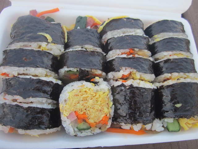 今回は、夕食を予定していた食堂で食べられなかったため、思い切ってこちらのお店のキムパッを購入してみました。ここのキムパッは2019年3月時点で2本8000Wもするので、キムパッとしてはかなり高額だと思いますが、中央にふわっとした錦糸卵がぎっしりと詰まっていて、飽きの来ない優しい味わいが病みつきになる逸品だと思います。