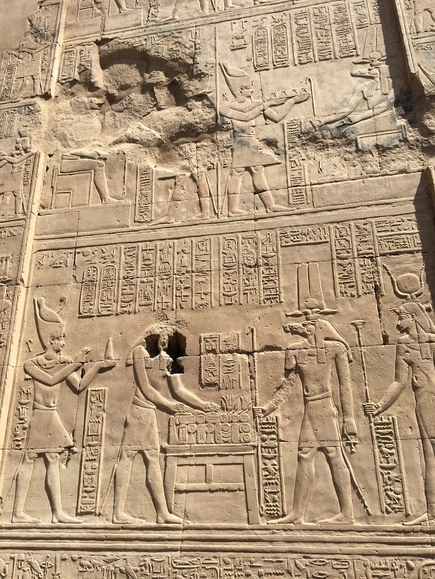 二重構造になっていて階段上の神殿と下の神殿に分かれています。二つの入り口が在りワニの神セベクとハヤブサの神ハロリエスの捧げられたという説明を聞くとナイル川沿いの神殿というのがよく理解できました。