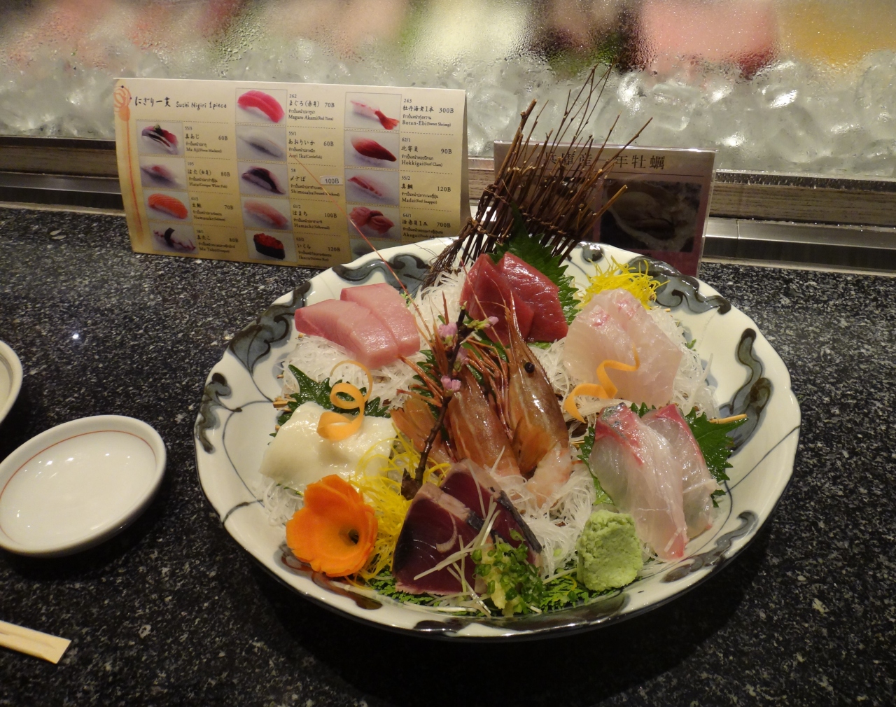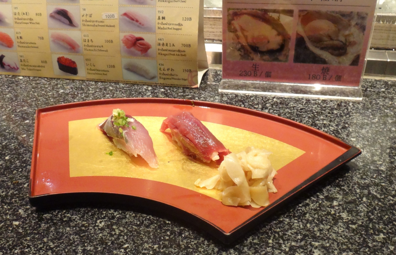 入ったら、いきなりショーケースが並ぶ日本のすし屋の造りだった。完全に日本語のメニューがあって、魚は日本から直送が売り。タイの魚を使ったお刺身が食べたかったのでちょっと残念。まあ、店の名前を考えれば、日本直送が当然なのか。