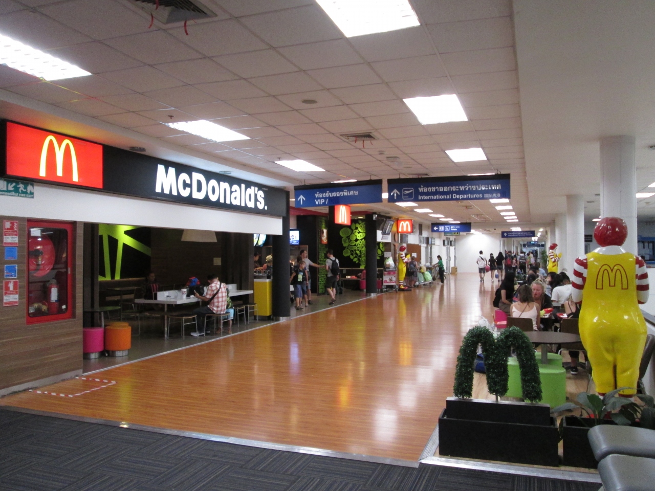 チェンマイ国際空港2階にマクドナルドがありました。空港の食事は高いものですが、ここのマックは市内で食べるのと同じ値段でした。なんと言ってもタイのドナルドは立って合掌しているのが特徴的ですが、チェンマイ滞在中に初めて見かけました。