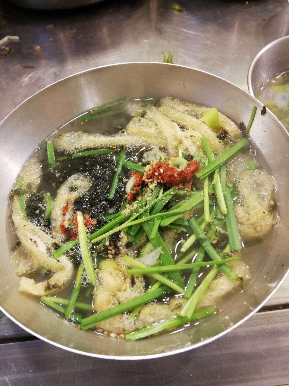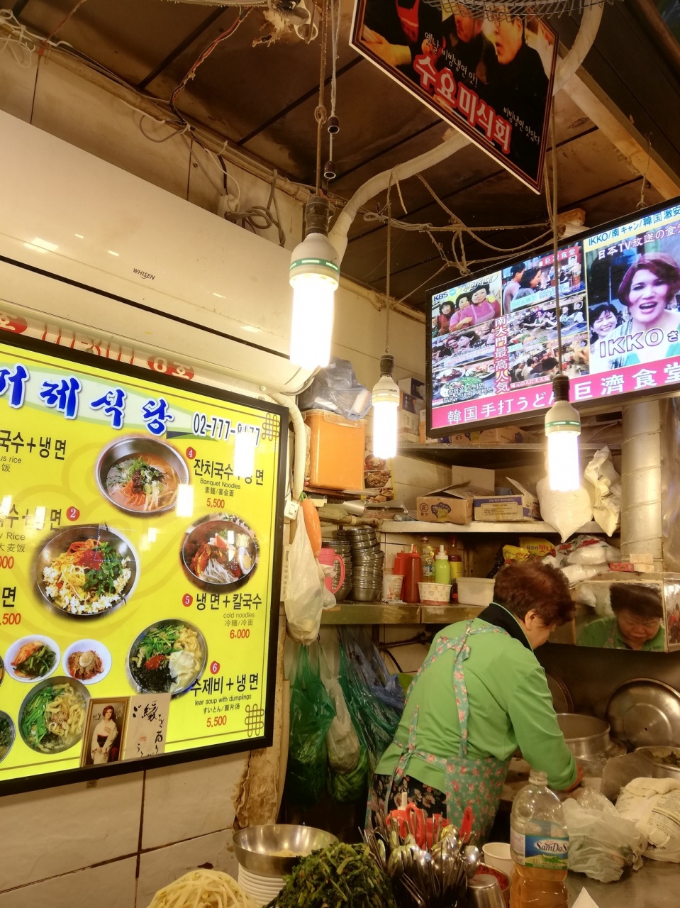 お店のおばちゃんの「IKKOさん!!ここ」の掛け声とIKKOさんの写真が目印です。カルグッスを頼むとビビン麺、ビビンパ、味噌汁、キムチがどんどん出てきます。