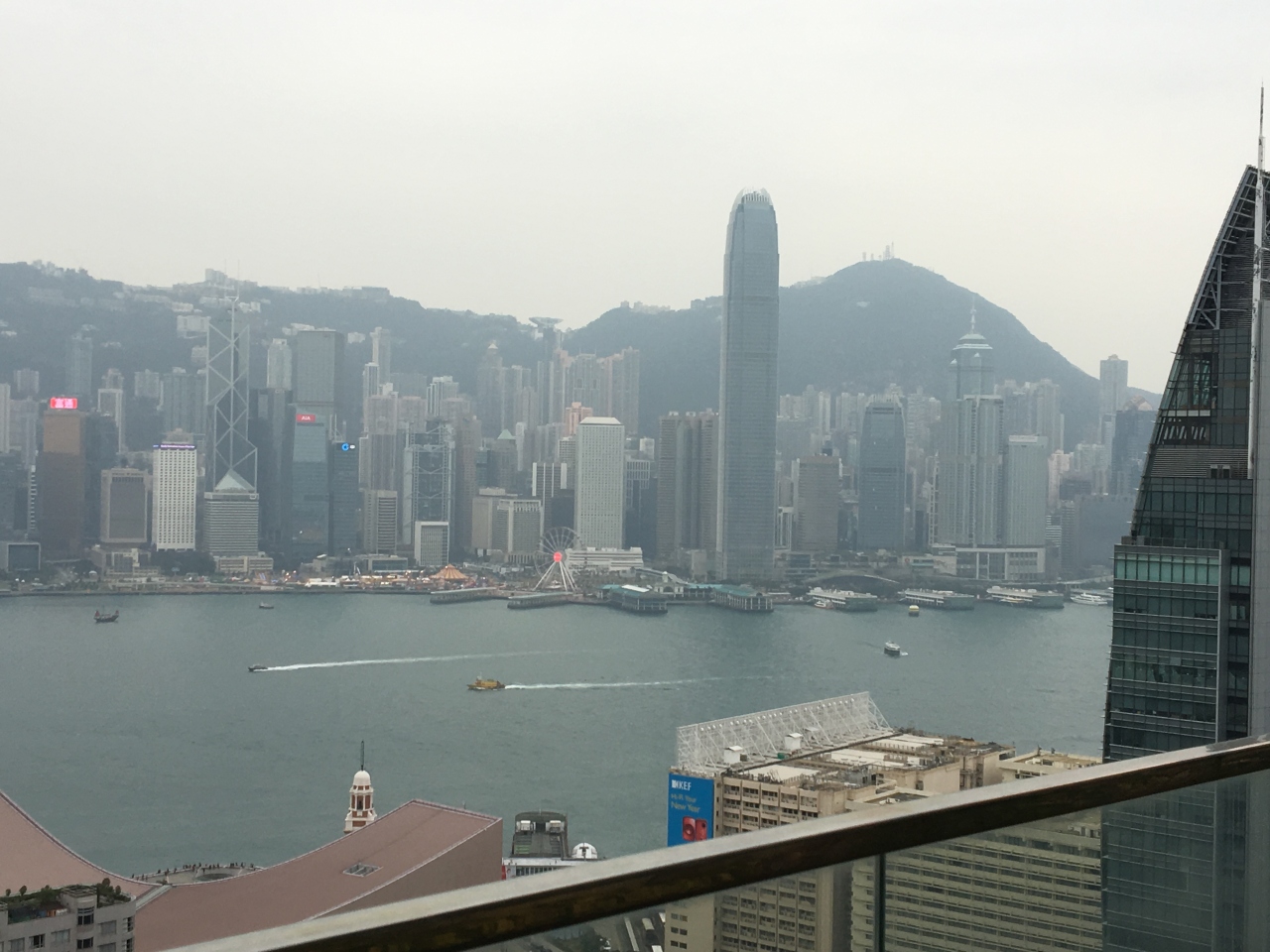 アイバーのバルコニーはオープンが15:00~01:00と書かれていたので15時になるのを待って早速出てみました。ビクトリア湾から香港島側のビル群まで見渡せ、シンフォニーオブライツを見るのには最高の場所かもしれません!