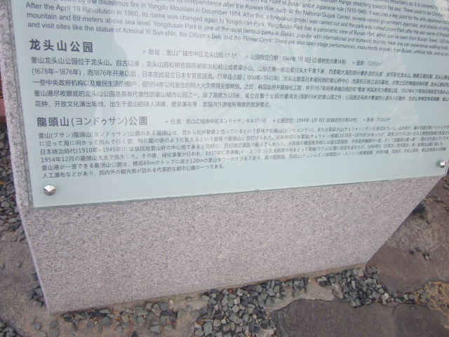 南浦洞の小高い丘の上に広がる公園ですが、都市鉄道の南浦駅側からは、エスカレーターで登ることが出来ますので、何となく、長崎の平和公園を彷彿とさせてくれる風情ですが、その仕様は全く異なっていて、こちらは派手な電飾で彩られた近未来的な雰囲気に圧倒されます。また、公園自体にも見所が多くて、春は桜も綺麗なので、お花見スポットとしてもお勧めできる公園です。あと、地味な見所としてはここには韓国では珍しいという、秒針付きの花時計が設置されていたりするので、話のタネに是非確認してみて下さい。
