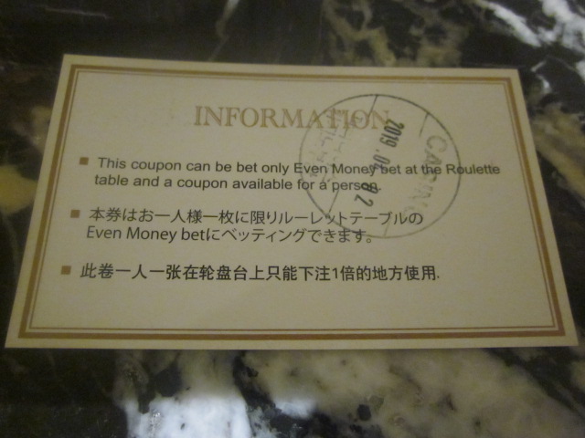 この10000Wのクーポンは、ルーレットコーナーの”二分の一”のベッドにしか使えないルールとなっていて、私は(赤・黒)の黒に賭けて、結局ルーレットは赤に止まってしまったので、一瞬で終わってしまいましたが、カジノ内ではお食事が頂けましたので、まあ良いかな、と割り切って出て来ました。
