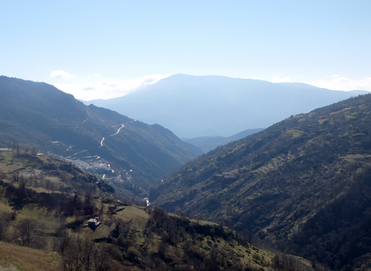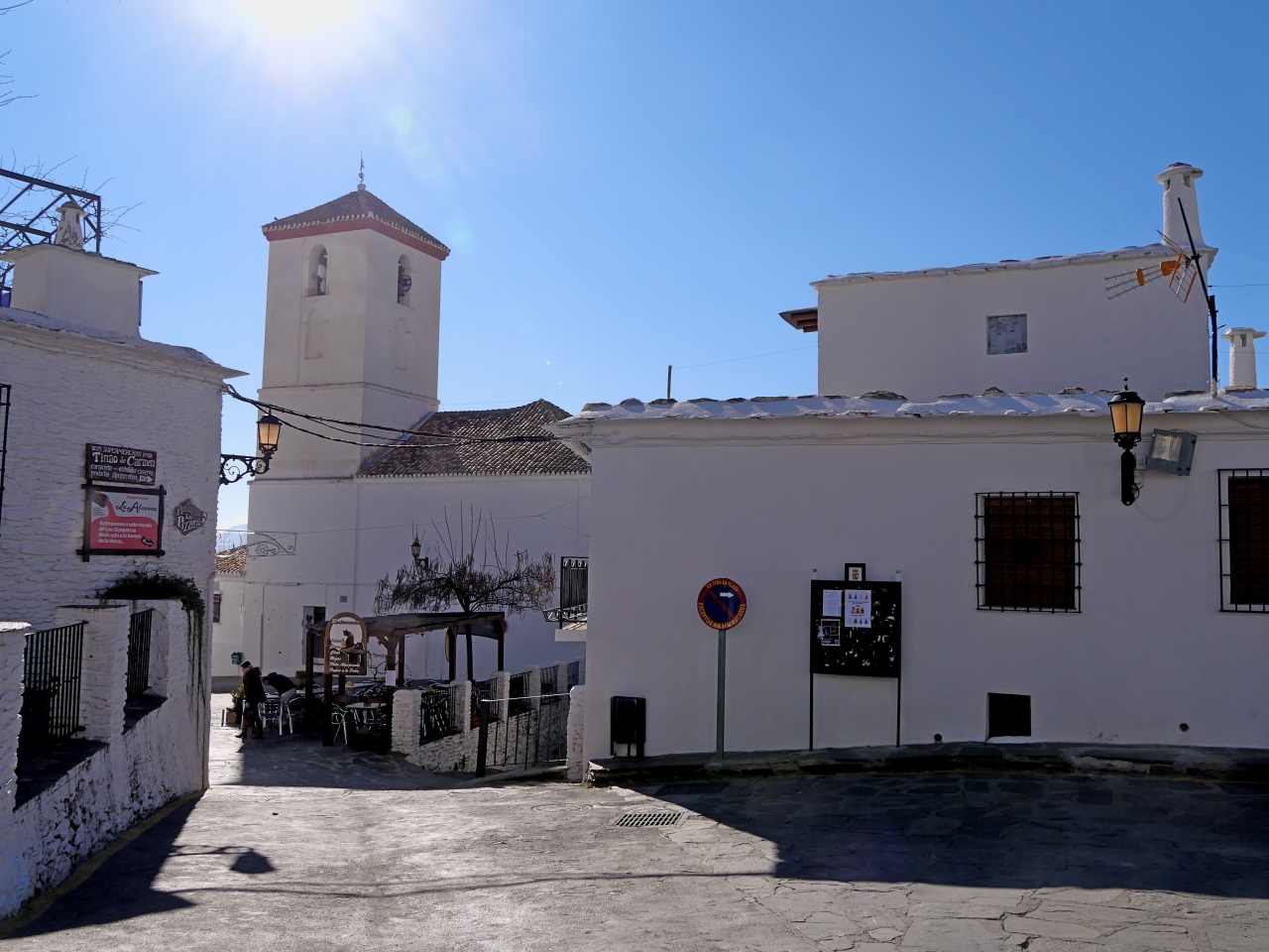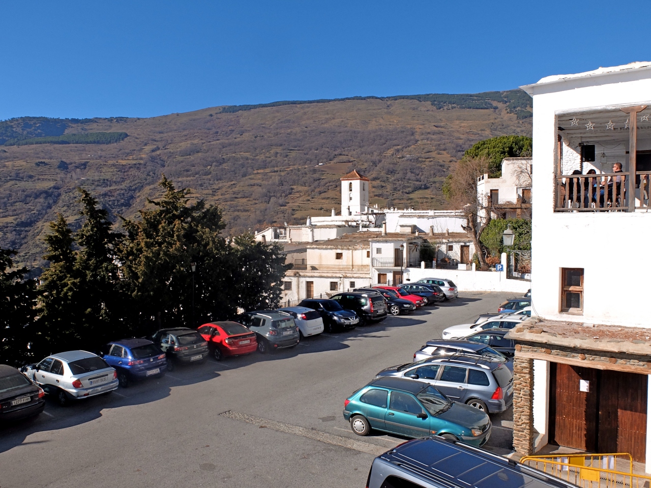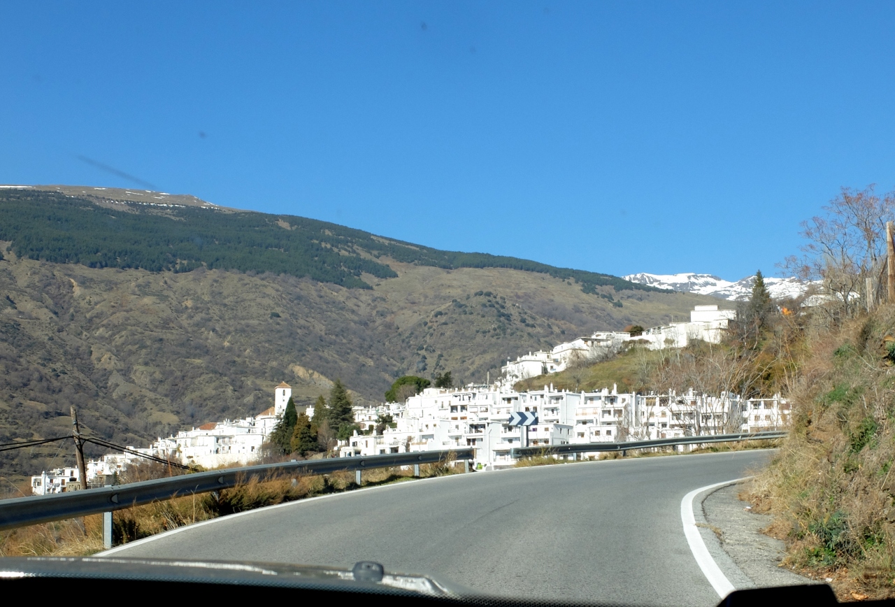 標高1420m 人口500人 1月3日の訪問だが南側斜面のためか雪などはない 暖かい 気温は12-13度と思う まさしく天上の白い村 白い壁が続くのはPampaneira以上 まあPanpaneiraでは特産のカーペットを所狭しと飾っていたからだが.Pampaneiraより人口が多い割には狭い村だ.下っていくとすぐに村の端に そこからは壮大な眺め