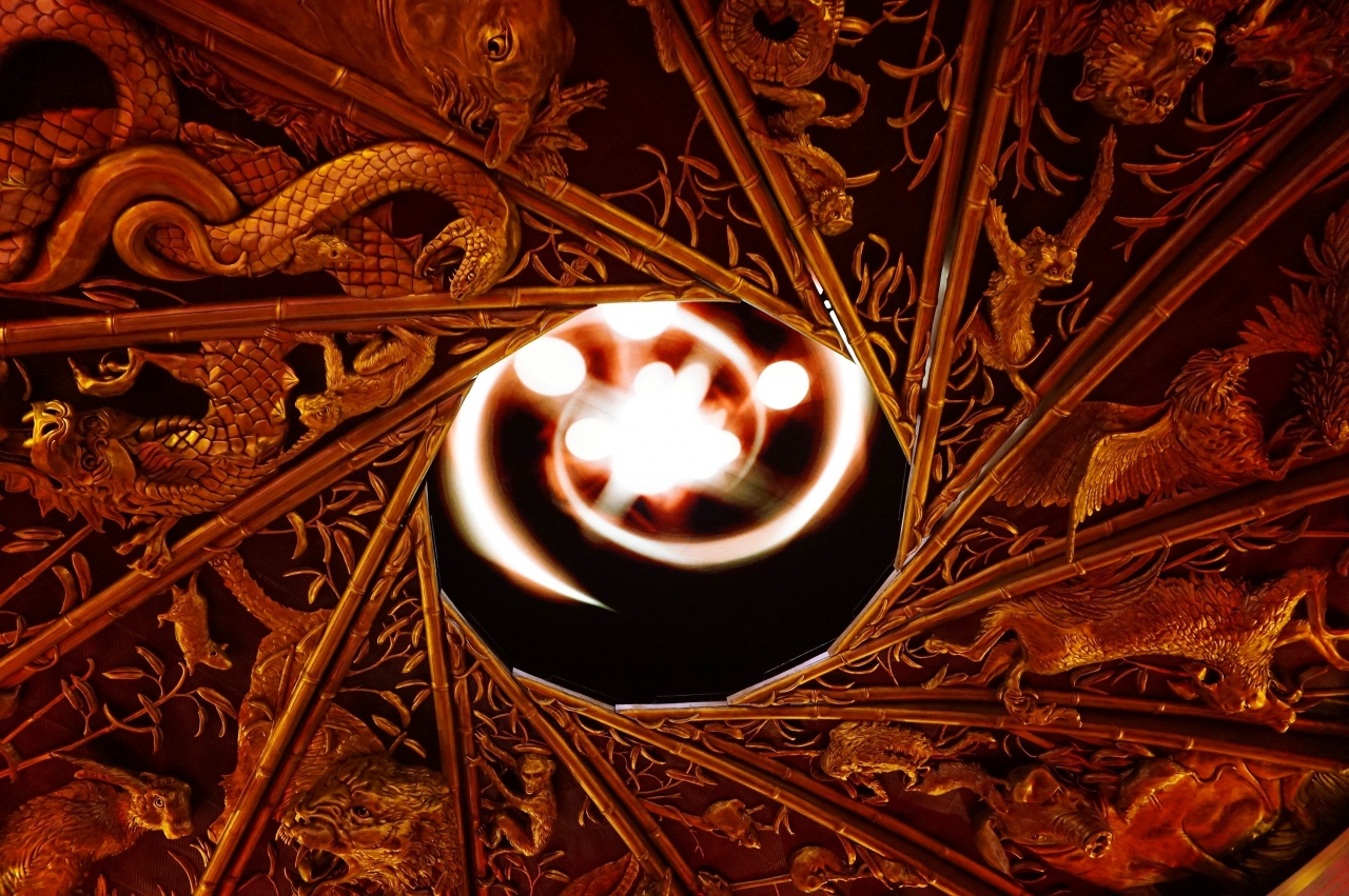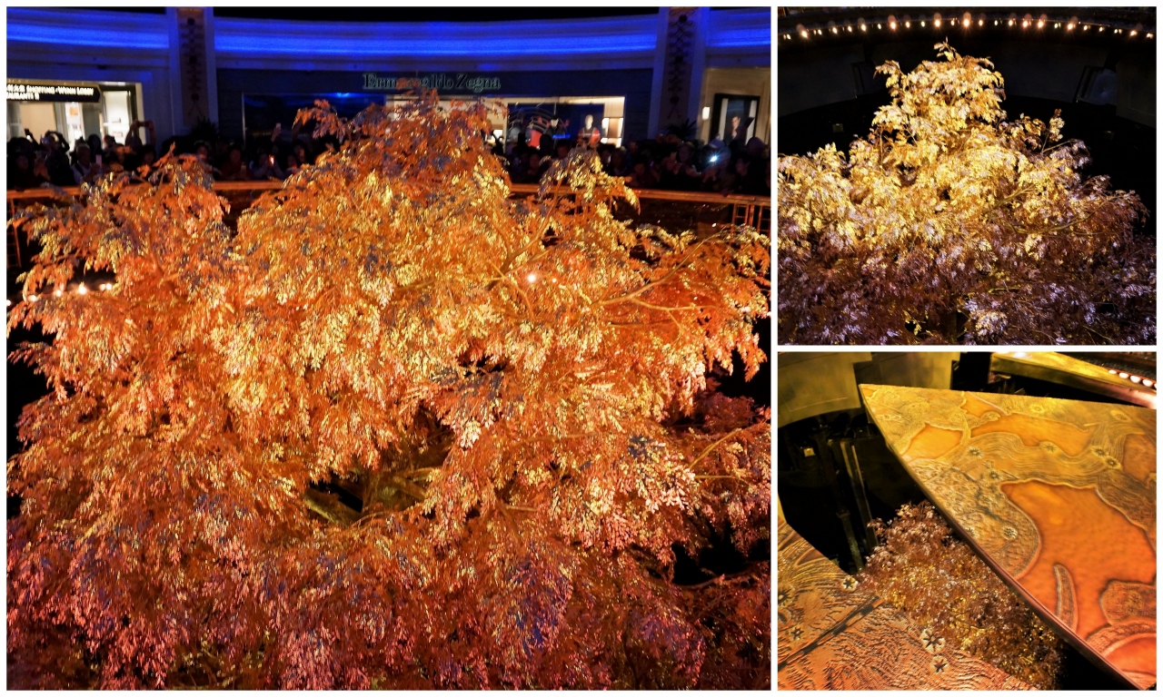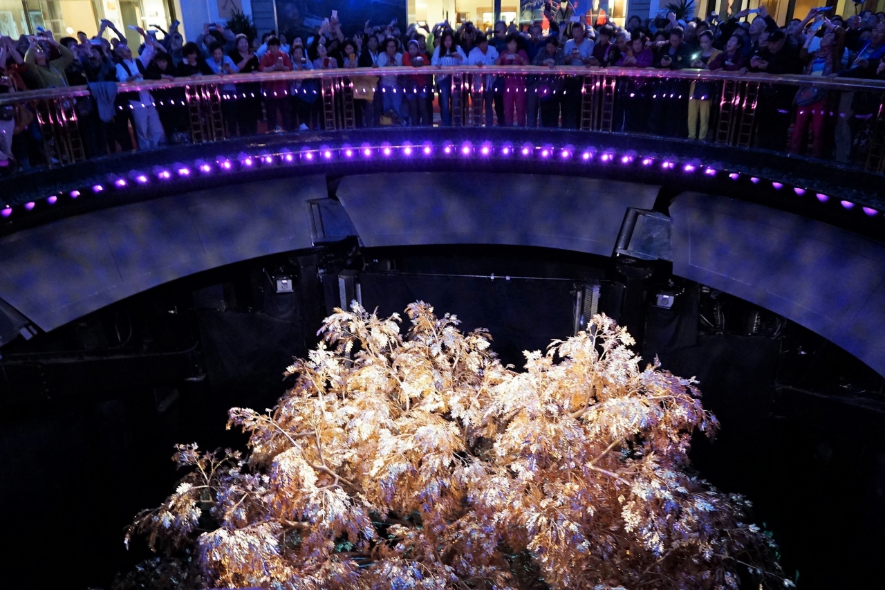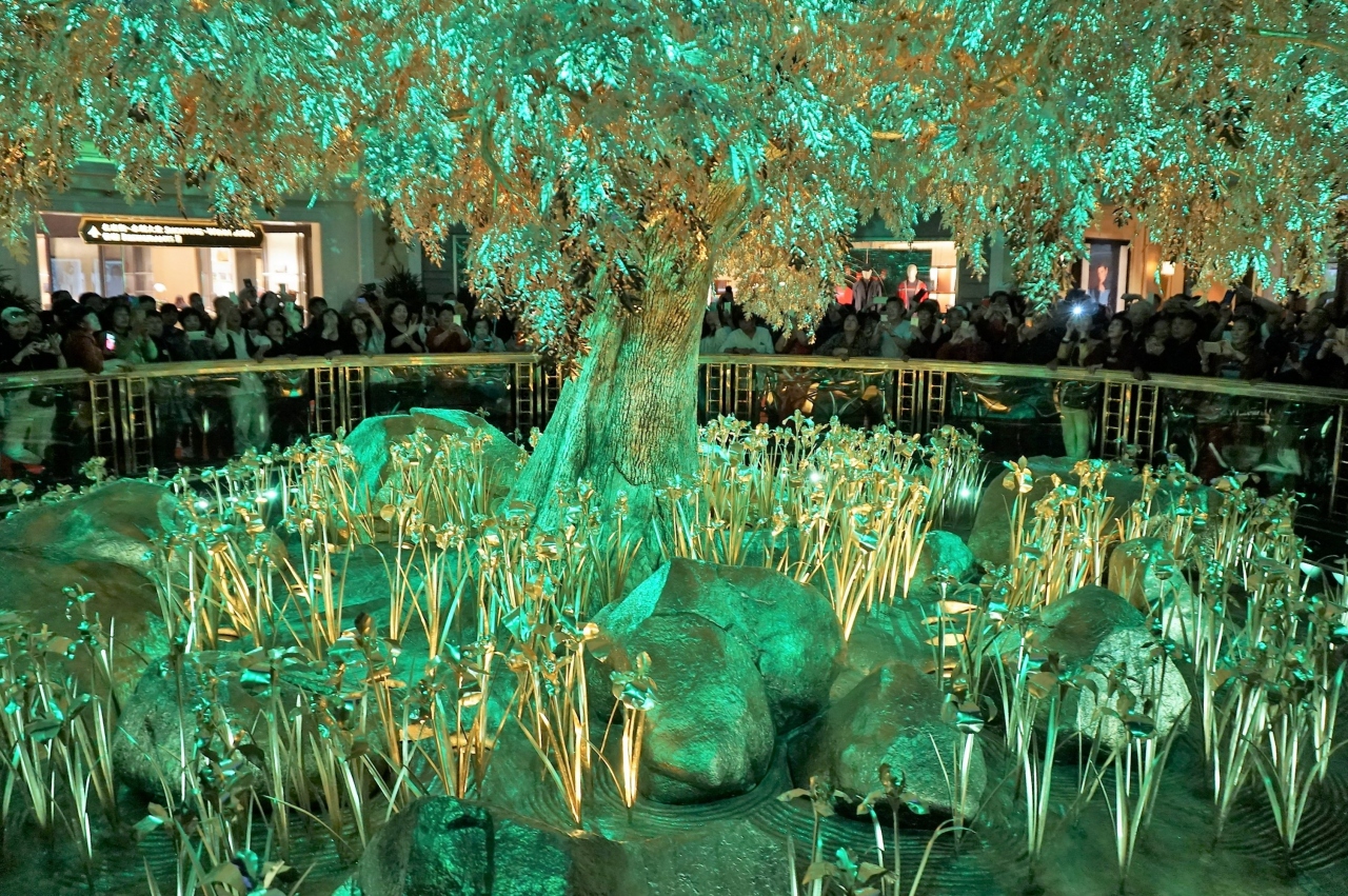 ウィン・マカオで行われる無料のショー。天井が開くと不思議な模様が現れ、やがて大きなシャンデリアが近づいてきます。そのタイミングでドームが開き、金色の大きな木がせりあがってくる様子には目を奪われます。その樹は色を変え、とても綺麗です。