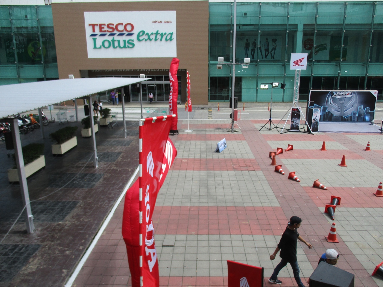 テスコ ロータス(ラマ4世通り店)のエントランスにバイクの試乗コースが設置されていました。富裕層が増えてきて車の販売が進んでいるように感じますが、バンコクでは依然としてバイクがポピュラーな移動手段となっています。また、日本人としてホンダバイクを販売していたのがいい印象を受けました。