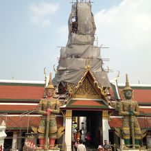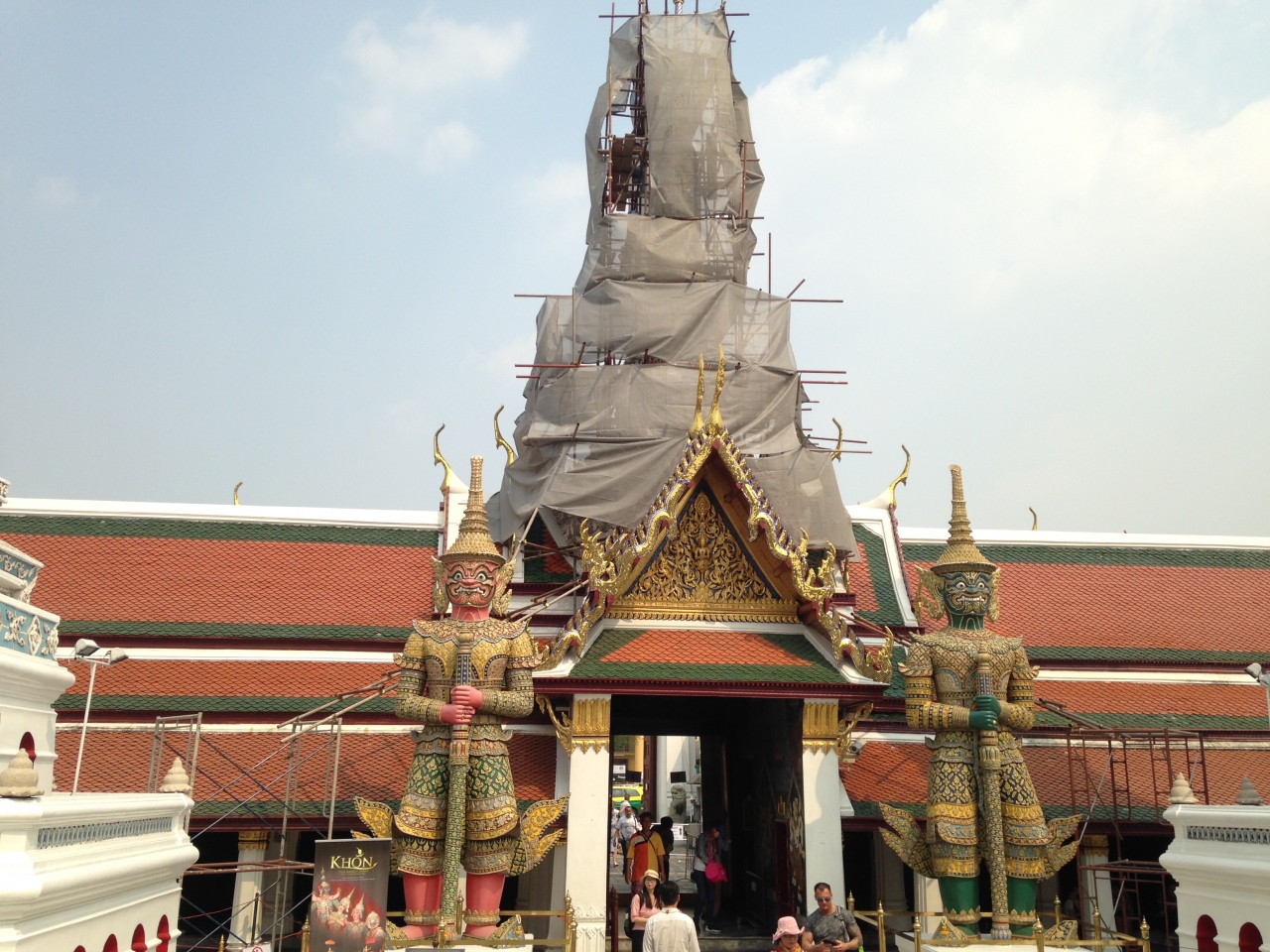 ワット・プラケオの入り口の右手にある王宮に行く出口の前に左右にたっている鬼神です。右側は緑色で左側は赤色の鬼神です。王宮へいつ渡ったのか、全然気づきませんでしたが、後からこの門が境目だったことが判明しました。