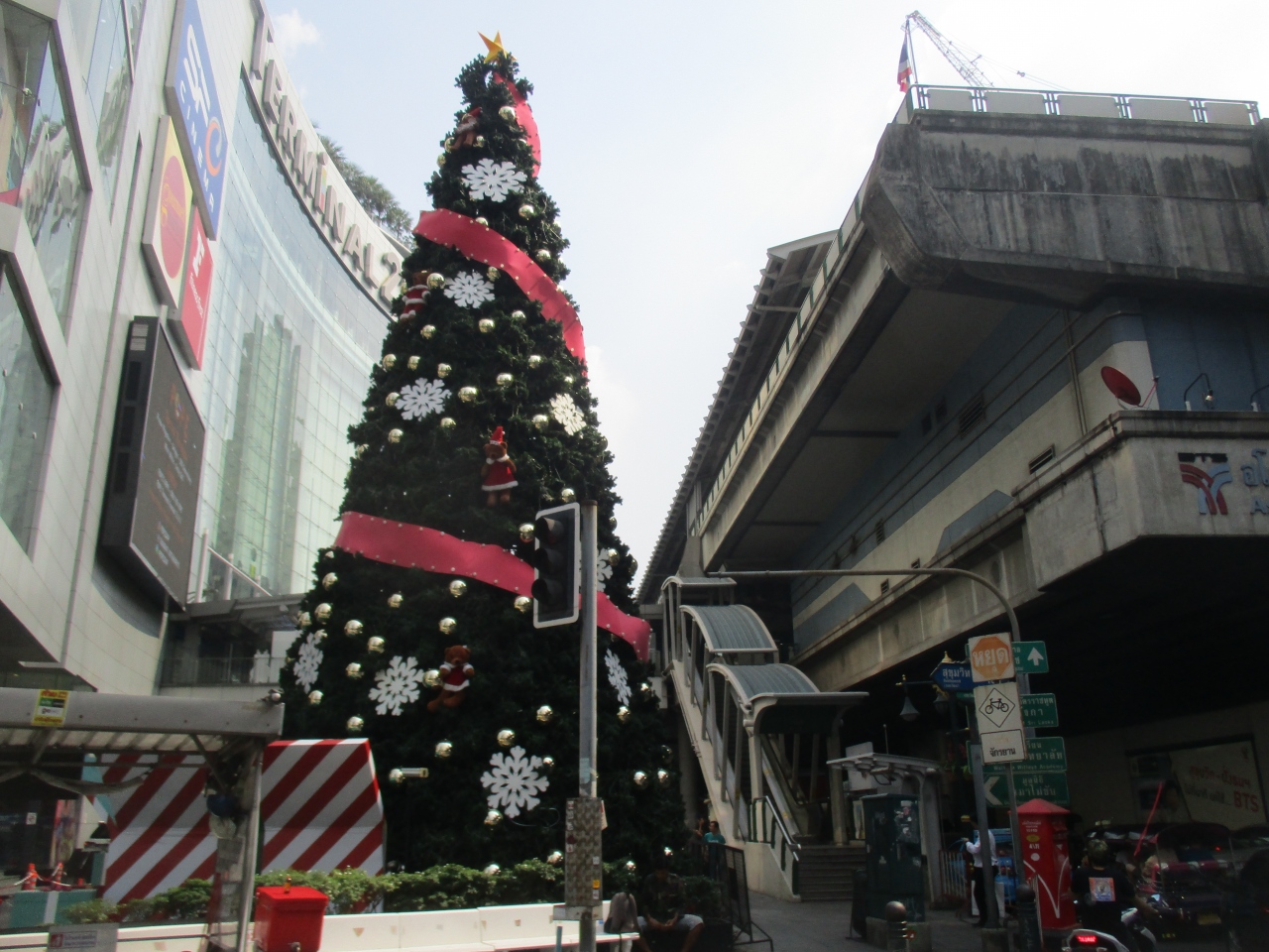 クリスマスシーズンのアソーク駅を利用しました。駅前には毎年恒例の大きいクリスマスツリーが飾られていました。ツリーはBTSスクンビット線の高架と同じくらいの高さでした。夕方頃から点灯しはじめ、夜になるときれいな電飾になりました。