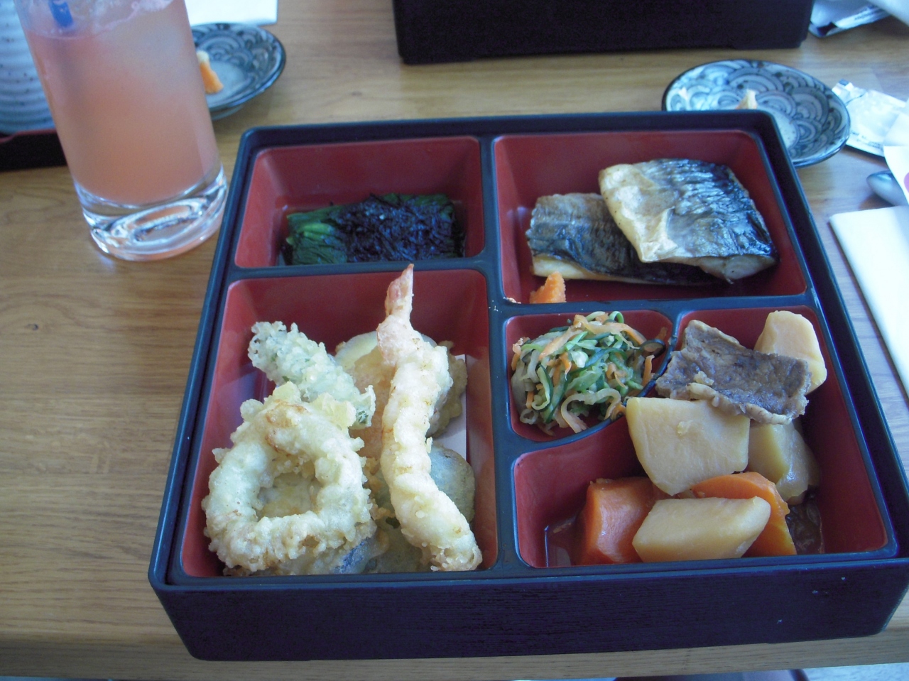 昼食の和食は弁当風のセットになっており、天ぷら、鯖の焼魚、肉じゃが、野菜の和え物などのおかずが入っていました。