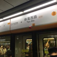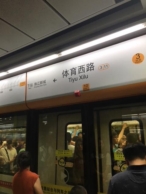 広州空港から5号線の五羊邨駅にあるホテルへ向かいました。まずは空港駅の騎場南で3号線に乗車し珠江新城駅で5号線に乗り換えたかったのですが、電車が一つ手前のこの体育西路止まりでした。仕方ないのでここで反対ホームに来た同じ3号線に乗り換えて珠江新駅に向かいました。