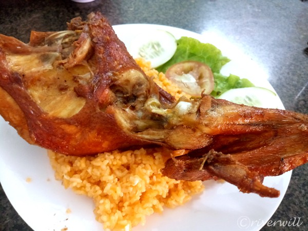 一番の人気メニューはチキンライスに鶏もも肉のフライドチキンが乗っかっているアイテム「コムガークアイ」