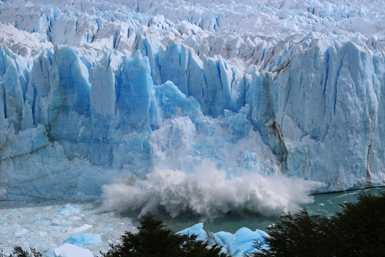 崩落の起こる前にミシッ、ミシッと何度か氷河が裂ける音の後、雷鳴を思わせる轟音とともに巨大な氷の塊が湖へと崩れていきます。その雄大さ、迫力、そして美しさは、言葉に表せない感動でした。