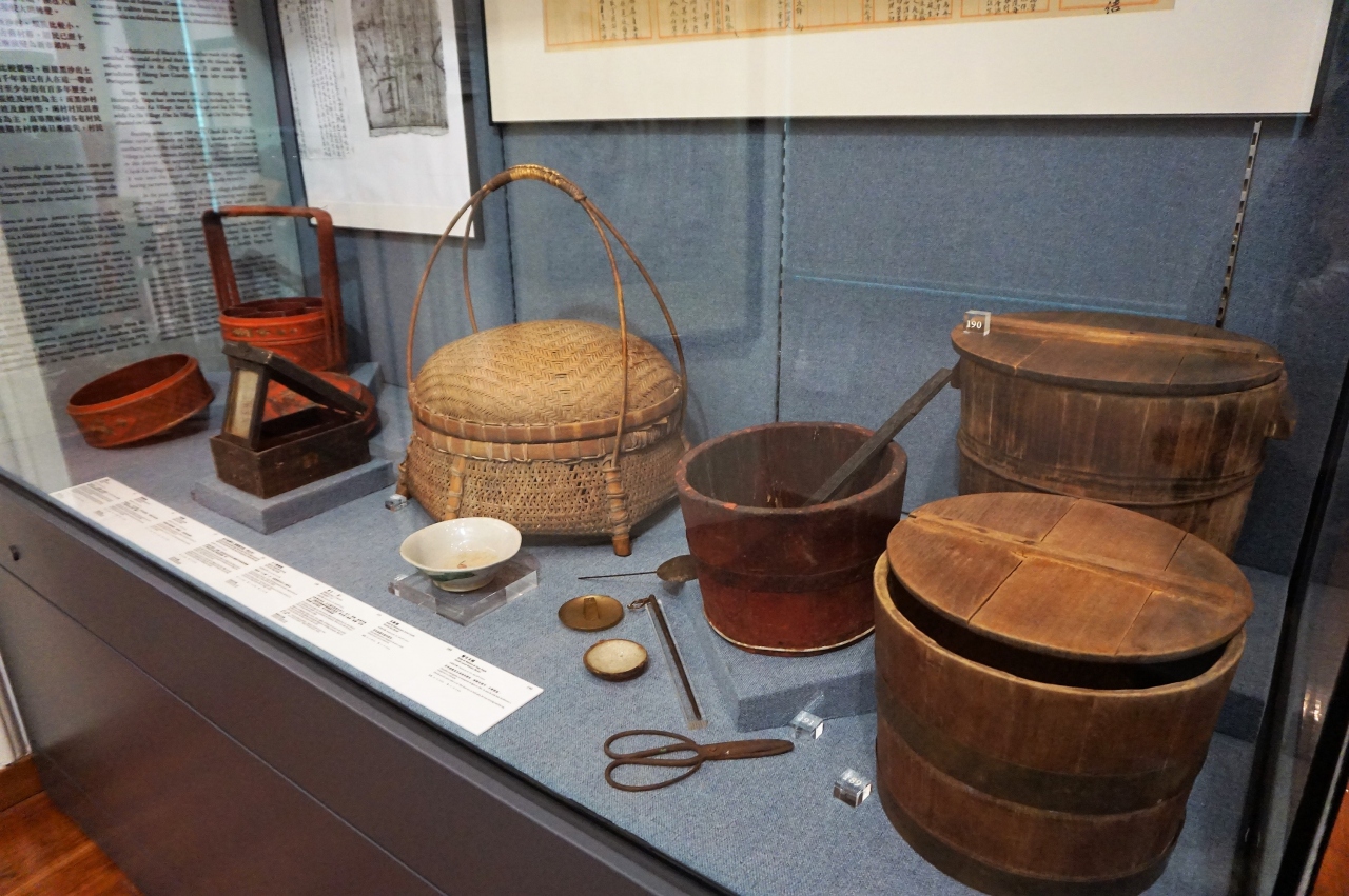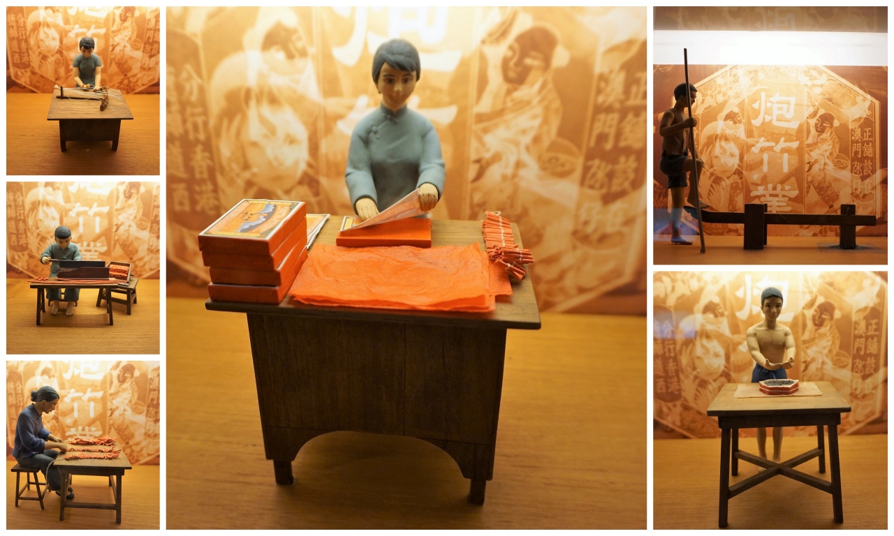 1階は、建物の地下からの出土品などが展示されています。2階には、婚礼時に女性が持参したという4つの道具のほか、マカオの主要産業だった爆竹の製造工程が人形を使って展示されているのが興味深かったです。