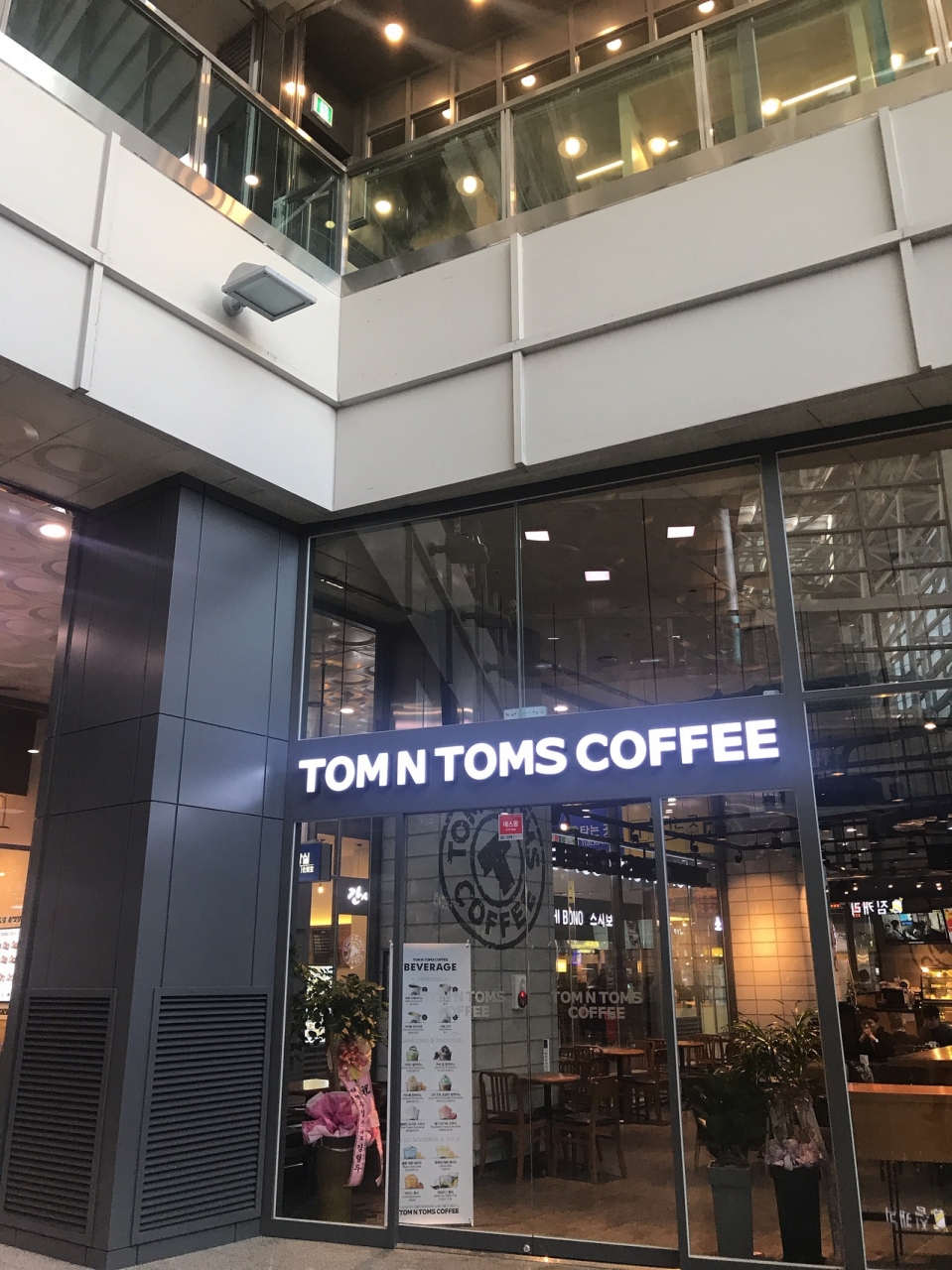 韓国の釜山駅構内にあるトムアンドトムズコーヒーです。これも韓国では結構有名なコーヒーチェーンです。地下鉄の釜山駅に行く途中にありました。全面ガラス張りで、とても開放感のあるカフェでした。シックでおしゃれな雰囲気です。