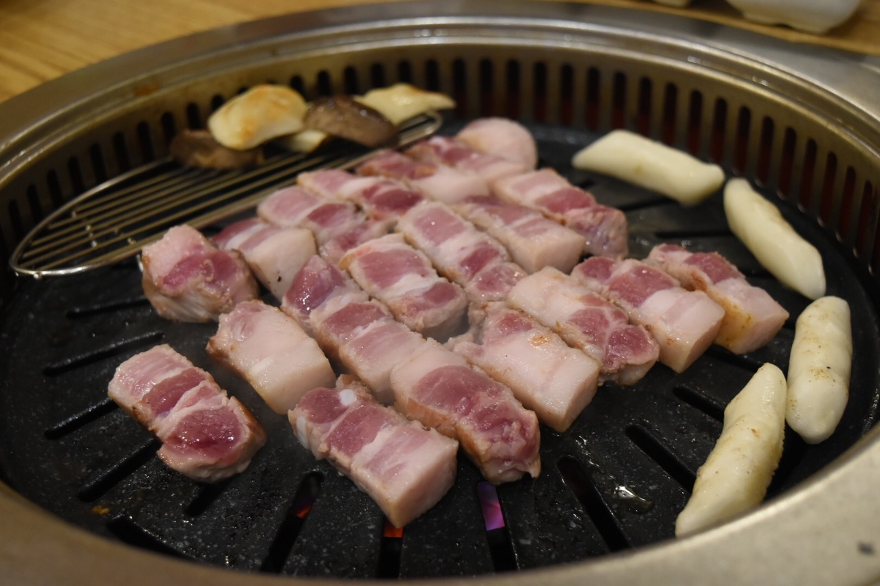 サラダやキムチはセルフサービスで食べ放です。肉は店員さんが焼いてうまく焼いてくれるので心配いりません。サムギョプサルを塩につけてレタスで巻いて食べるのが最高でした。