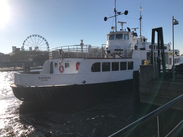 スオメンリンナ島へフェリーで渡りました。マーケット市場に乗り場があります。公共交通機関が乗り放題の1ディチケットを持っていたのでそれで乗車できました。スオメンリンナ島まで15分足らずでした。2階建の高速船で、車も数台載せれます。楽チンでした。