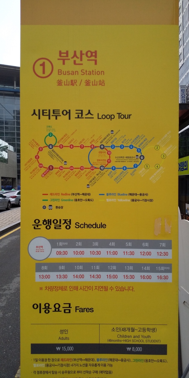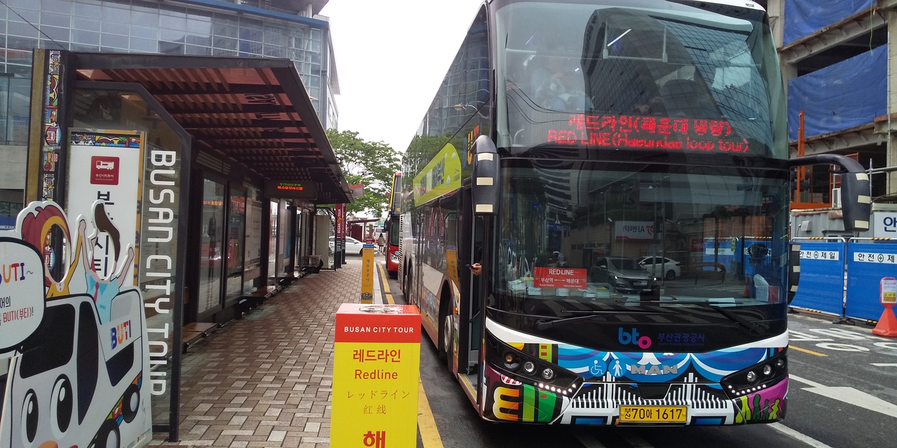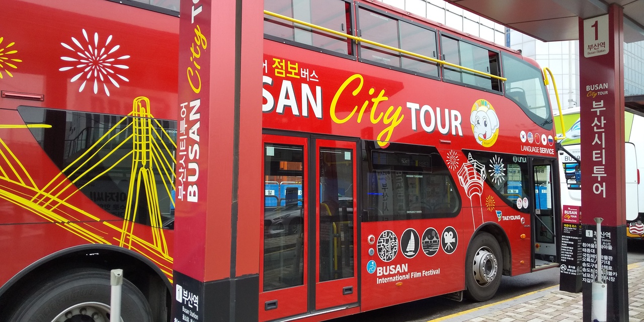 釜山駅、東横INN前が乗り場になっています。コースにもよりますが、二階建てバス、オープントップバスで運行しているので車窓の景色も高い位置から楽しめます。