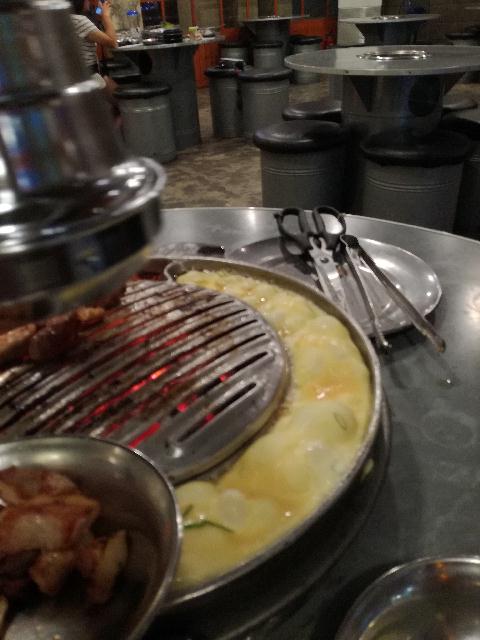 この店の焼肉プレートが独特で、脇の溝に溶き卵とキムチを入れて一緒に焼きます。