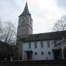チューリッヒ中央駅からリマト川方面へ歩き、バーンホフ通りを南下し、リンデンホフの丘を登って下れば大きな時計塔の教会が見えるので、行きやすいです。時計の文字盤は直径8メートル以上あり、ヨーロッパ最大。塔は13世紀に建てられたロマネスク様式。ですが、小さな教会です。中を見られるので是非。3大宗教建築物とはこことフラウミュンスター、グロウミュンスターです。