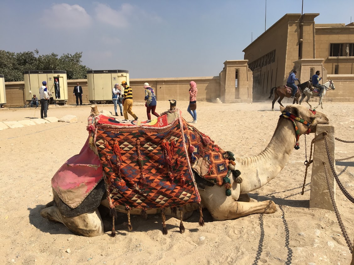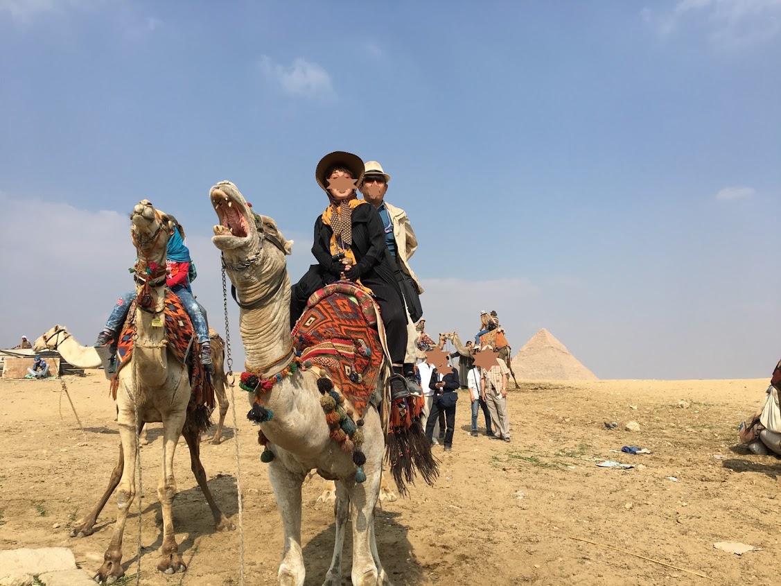 三大ピラミッドはとても大きいので三つを一緒に撮影するためにはピラミッドの前からバスで10分位の丘に行き撮影します。その丘の上ではらくだの背中に乗って少しの時間ですが砂漠の上を歩く事が出来ます。ピラミッドとらくだはとても絵になります。
