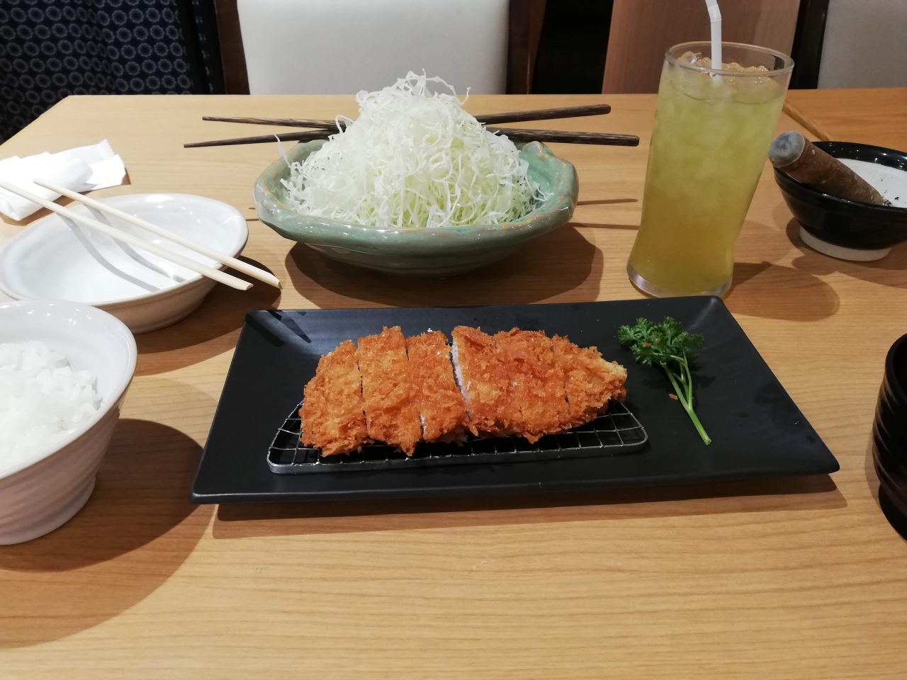 おなじみのサボテンです。タイでもとんかつは大人気で休日ともなれば家族連れでにぎわいます。キャベツ・ご飯・味噌汁がお替り自由なのは日本と同じシステム。税・サービス料が別に取られるので、また為替がバーツ高なので、日本で食べるより割高です。短期の旅行者にはあまりメリットはないかな。