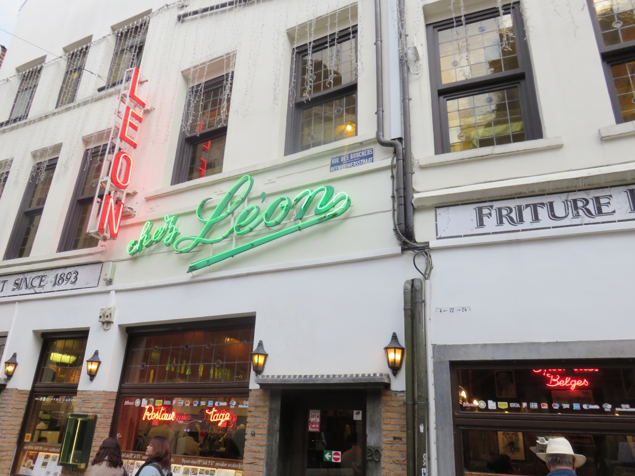 グラン・プラスから徒歩数分のところにある「イロ・サクレ地区」には数々のレストランがひしめいています。創業1893年という老舗レストラン「シェ・レオン」でムール貝、フリッツ(ベルギー風フライドポテト)、ビールのセットメニューが定番でした。
