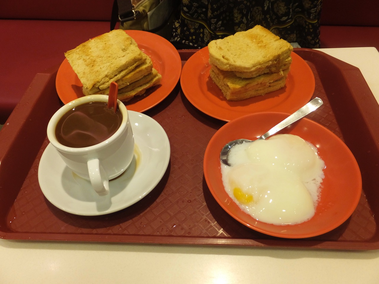 ホテルの朝食でもよかったのですが、せっかくシンガポールにきたのだから、と、ホテル近くのブギスジャンクションの地下にあったヤ・クン・カヤトーストでカヤトーストでの朝食を、ということになり、訪問。朝何時から開いているか不安だったのですが、8時すぎの訪問時にはすでに開店していました。いろんなセットがありますが、普通は生卵とのセットを頼むようです。店頭表示は4.8ドル(約400円)のセットメニューばかり。しかし、単品もありました。注文してから出来たら呼ばれるタイプ。たっぷり練乳のコピ(コーヒー)といっしょにどうぞ。