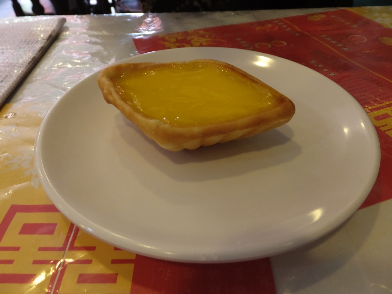 ともかく渡って店内。エッグタルトだけでなくクッキー系がいっぱい。そしてなんと店内にテーブルと椅子を発見。店内でいただくことができました。買ったエッグタルトをそのまま持って席へ。濃厚な卵味が印象的でした。