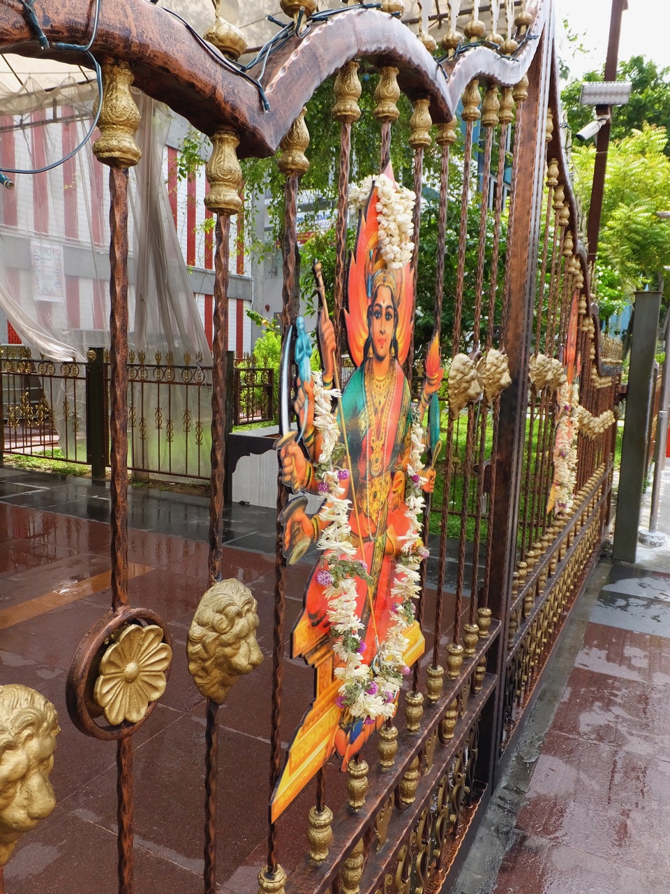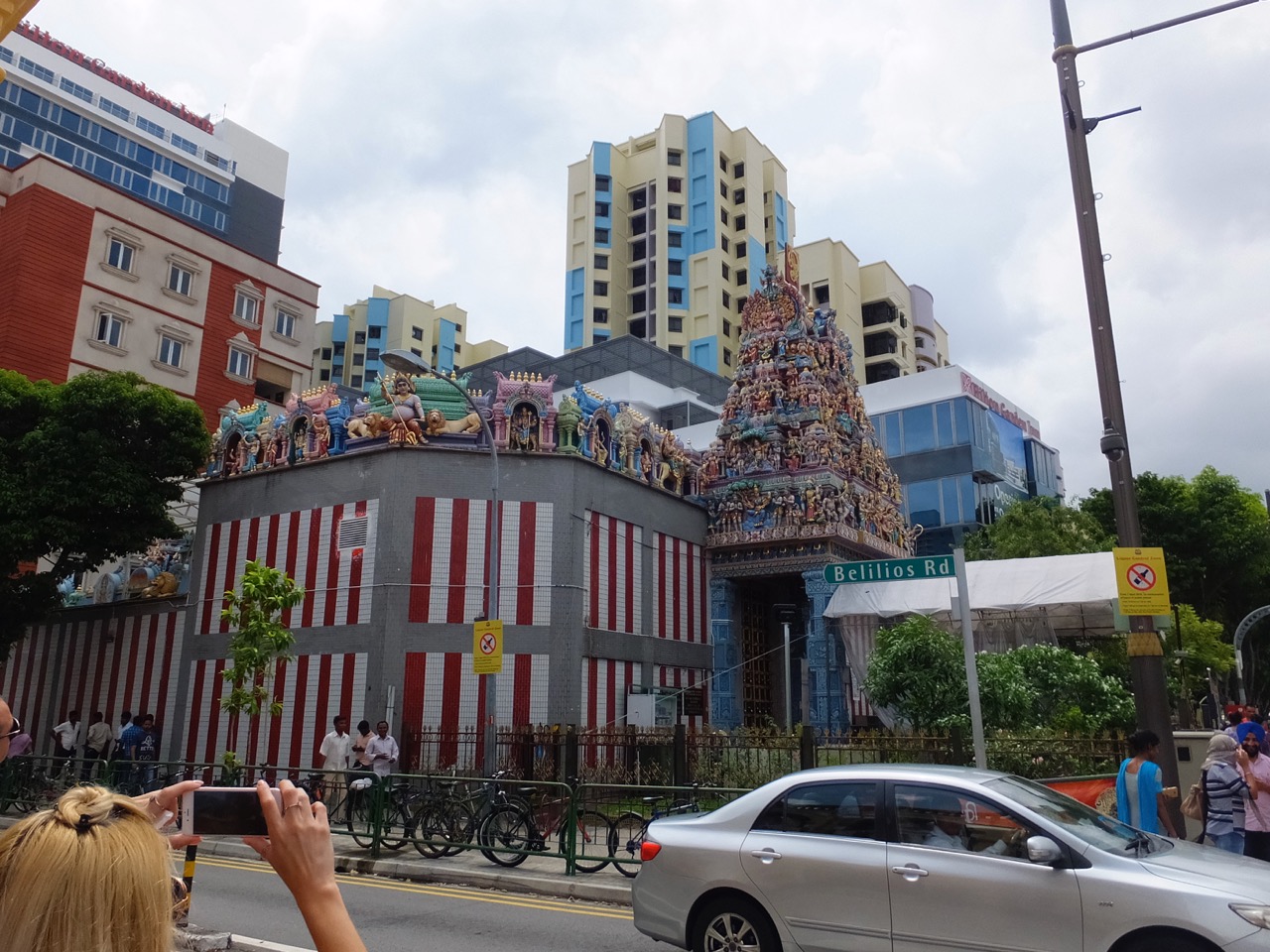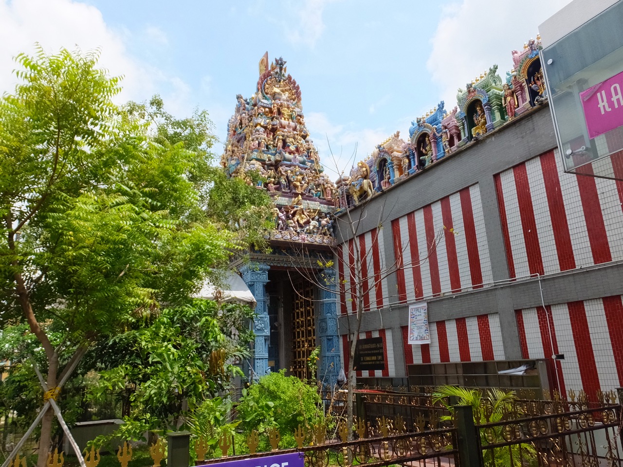 シンガポールで寺院というと普通の日本の仏教のような寺だけでなく、ヒンズー教(いえ、ヒンズー教も仏教ですが)の寺院もあります。ここリトルインディアの中心にあるのがこの寺院。あの、いろんな神様の彫り物が建物の上にいっぱい乗った感じが異国を感じさせます。とくにその像が積み上がったゴープラム(門、でしょうか)はすごい迫力。