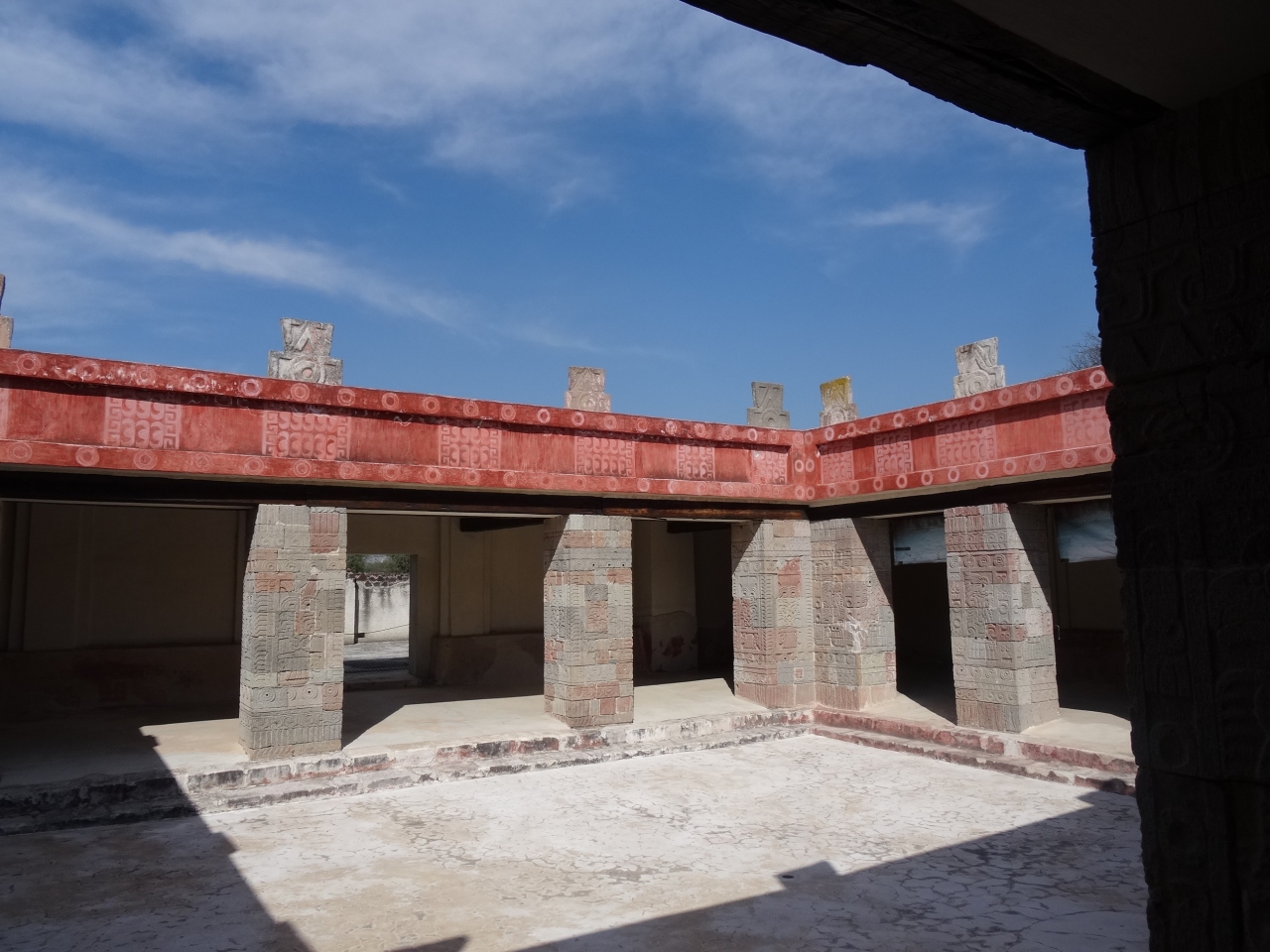 また、回廊の柱に彫られたケツァルパパトルのレリーフも愛嬌のある表情で見ごたえがあります。