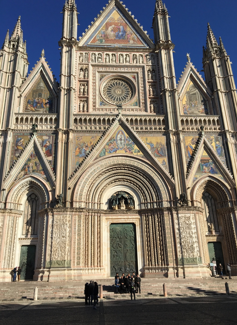 大聖堂です。オルヴィエートの旧市街はこの大聖堂を中心に街が造られているように思いした。大聖堂の正面の壁には柔らかな色合いで聖書の一場面が描かれて楚々としたたたずまいですが
