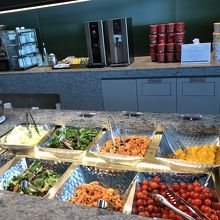 食事はサラダ、ホットミール4種とスープ、もちろん辛ラーメンもあります。