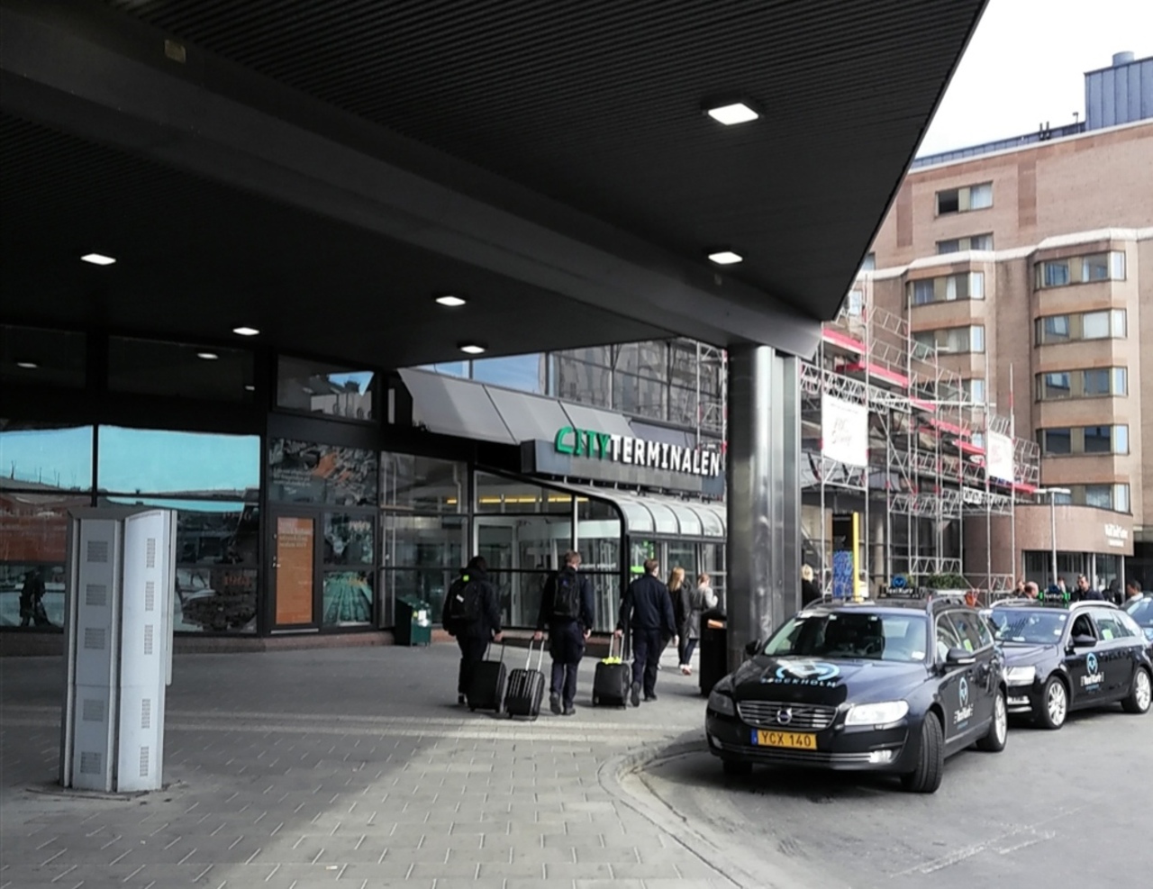 コペンハーゲンからストックホルムまで列車で到着したら、ホームの一番後ろのほうの階段を上って、駅を出ます。すると、道路の向こう側に茶色のビルに緑の文字が見え、Cityterminalです。中はとても広い。中央にあるインフォメーションで港行きを聞きました。