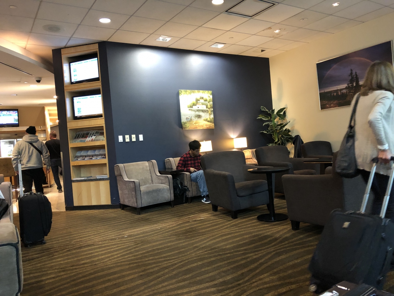 どちらも保安検査と入国審査を受けた後にあります。USAエリアの方からは、トーテムポールからカナダ入国審査の方角が見下ろす感じで見えます。カナダ国際線エリアの方が広く食事やドリンクも豊富ですが落ち着くのはUSAエリアの方です。感じもよかったです。プライオリティーカード可です。