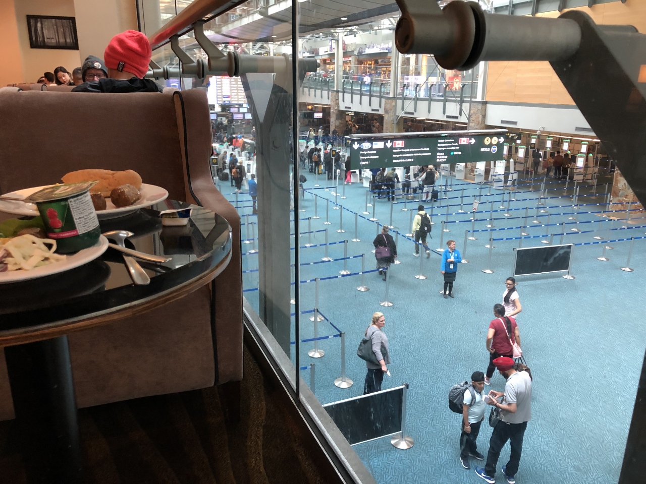 USAエリアのラウンジからはトーテムポールが見えて国際線エリアの方は食べ物が豊富