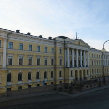 フィンランドの「政府宮殿」は、ヘルシンキ中心部にある元老院広場を囲む建築物のひとつです。クリームイエローの低層の建物で、正面に配置された柱や、アーチを描いた窓が印象的です。ヨーロッパならではの威厳と気品を感じる建物で、青空を背景に写真映えしました。