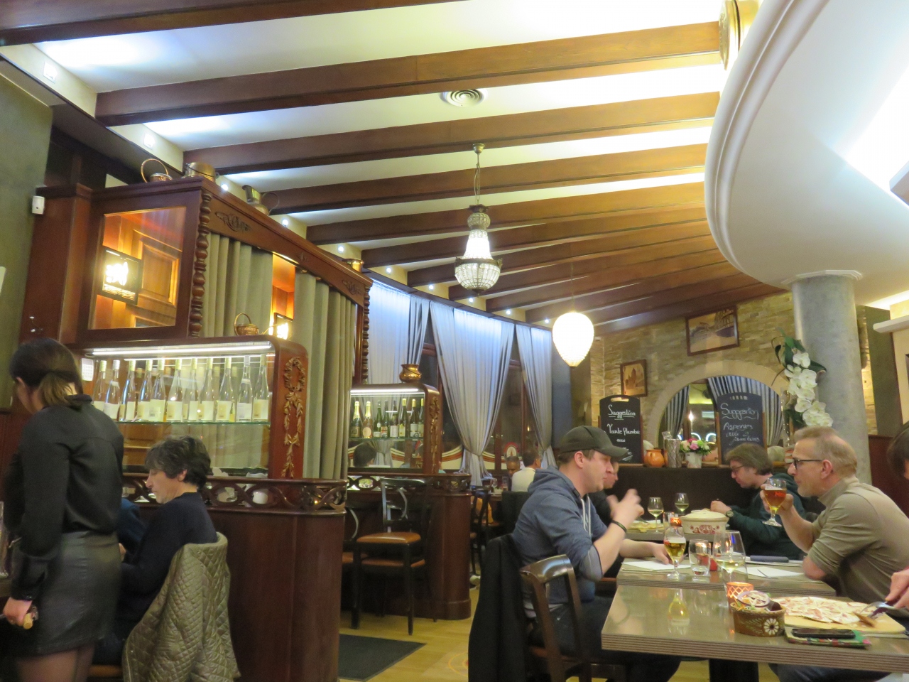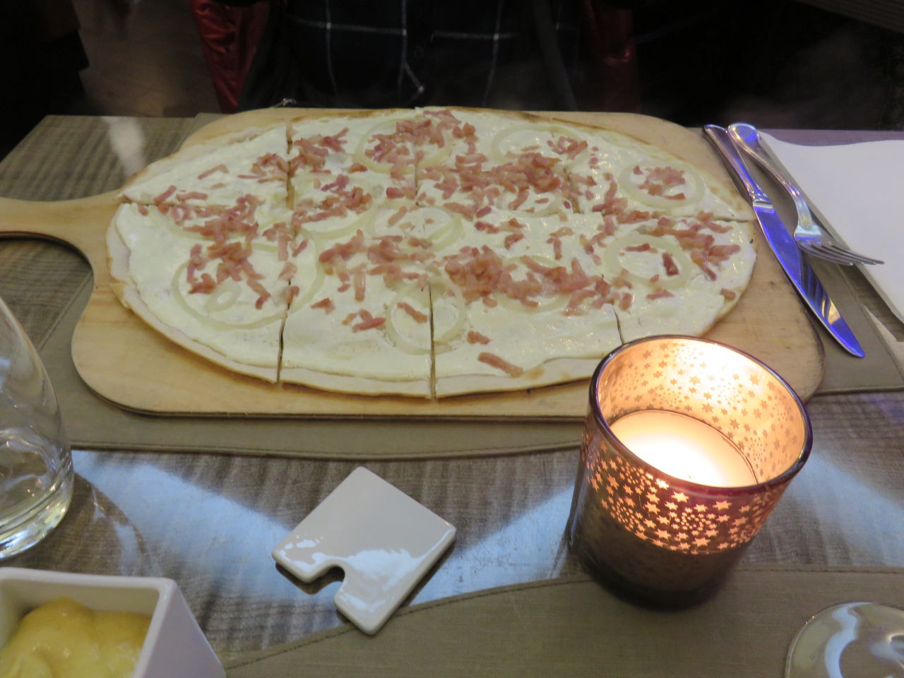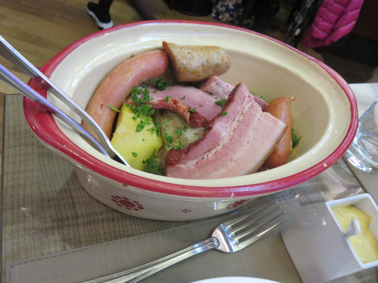 「タルトフランベ」はタルトと言うより薄いピザに近いもので、チーズ・タマネギ・ベーコンを薄い生地に伸ばして焼いたもの、次いで「シュークルート」はドイツではザワークラウトと呼ばれるもの、ただし塩漬けの酸っぱさは全く無く断然いいですね。