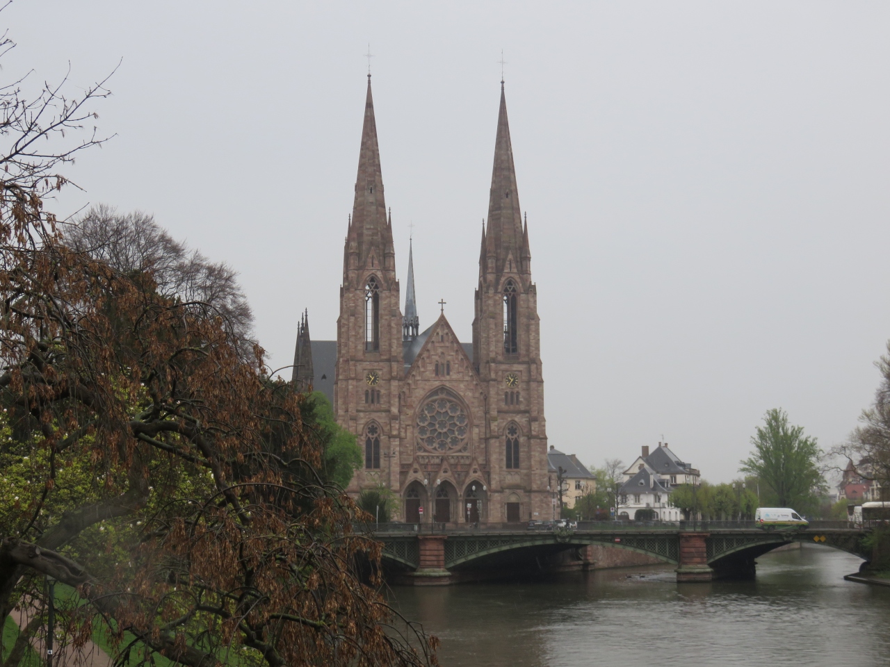 イル川の中洲の南端にある教会で、建築家ルイス・ミュラーによって、ドイツ・マールブルクの聖エリザベート教会を模して1897年に建設されました。ネオゴシック様式の教会は、約76mと言われる2本の塔がとても印象的で、バラの窓や聖人が描いたステンドグラスは壮麗でした。