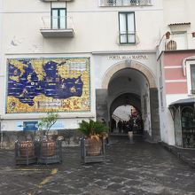アマルフィの駐車場から街中へ入る門です、先に海岸の防波堤に行ってから、この門をくぐって街中へ行きました、門は建物の一部のようです、それ程凝った門では有りませんが外側の脇に有るタイル画がとても良いですよ。