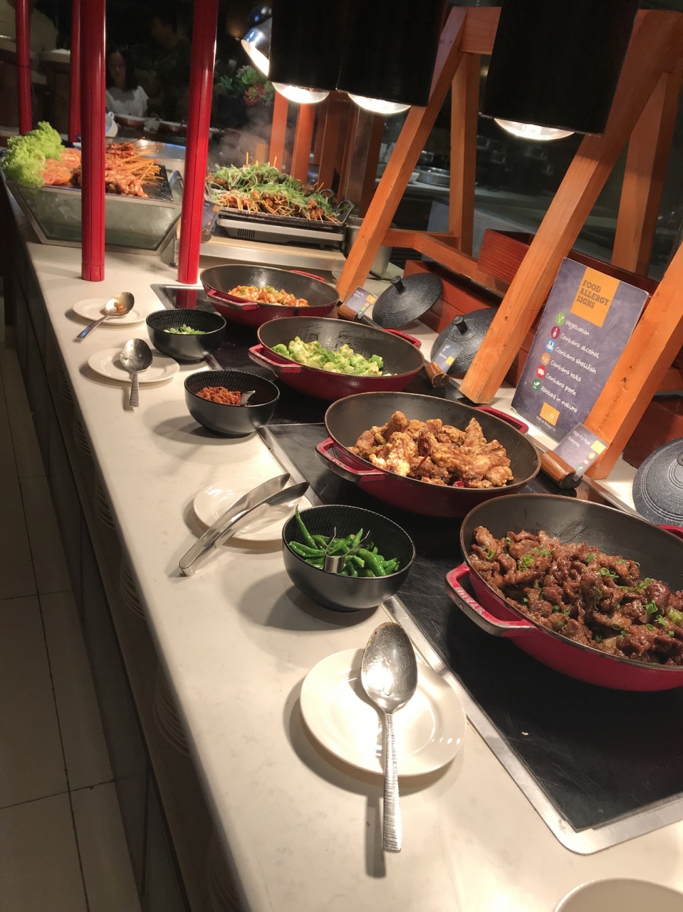。メインはレチョン、リブポーク、サテ、サーモンにヌードル、日替わりで、パスタやタコス、シーフードやお寿司も有りました。