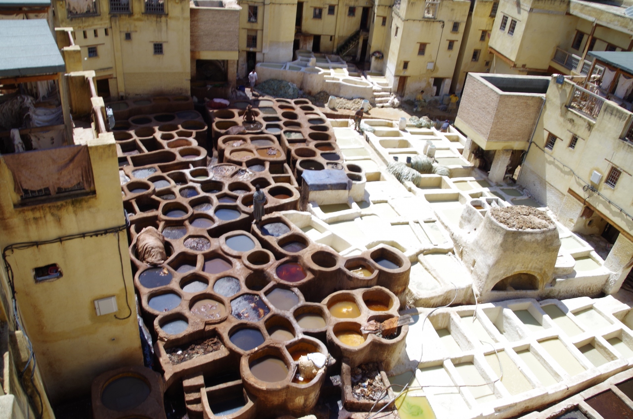 革製品のお店の屋上から、革の加工んp様子を見ることができます。革を乾かしていたり、革を染めている、大きな入れ物が沢山なならんでいます。革を染めるために、自然のもの(鳩の糞)を使っているので、臭いがあります。臭いを消すために、ミントの葉が有効ということで、ミントを鼻にあてていました。