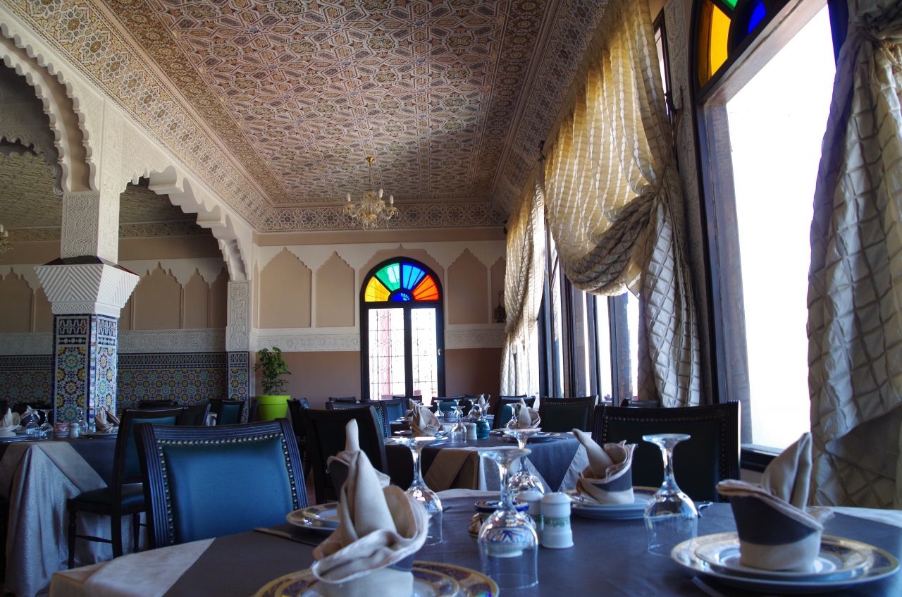 ステンドグラスが素敵な内装のレストランイカタジンをいただきました。大きなタジン鍋にイカのタジンがでてきました。日本人の口にも合う味でした。デザートは、クレープでした。こちらも、日本人の口に合う足であり、おいしくいただくことができました。