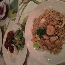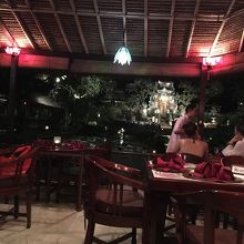 ウブドの宮殿近くにあるカフェ レストランです。隣の寺院を店の庭の池越しに眺める事が出来、ふんいきは抜群に良いです。窓際の席は予約で埋まっていました。料理は普通のナシゴレン等を注文しました。雰囲気を楽しむレストランと思います。