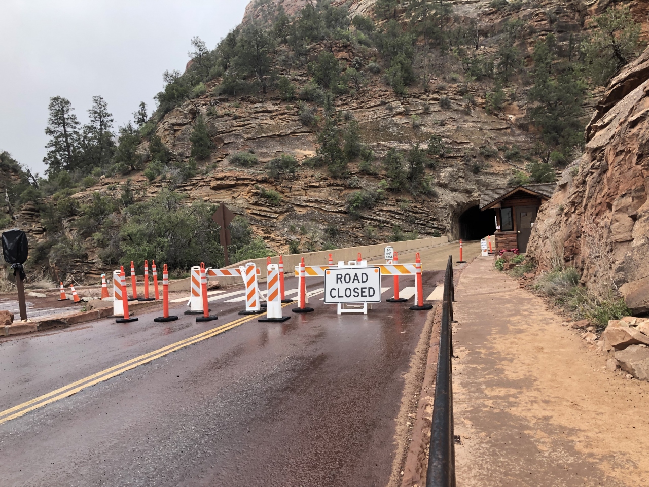 しかしながら、この道の山道の手前のトンネルで通行止め、あとわずか10マイルほどでビジターセンターや見所のあるザイオン国立公園中心地なのに行く事ができません
