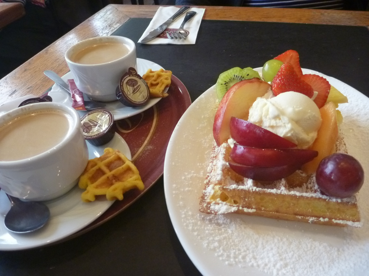 フルーツ山盛り乗せのワッフルを、主人とシェアーしましたが、あっさりしていてこれなら一人で1個食べられたかも。。。
