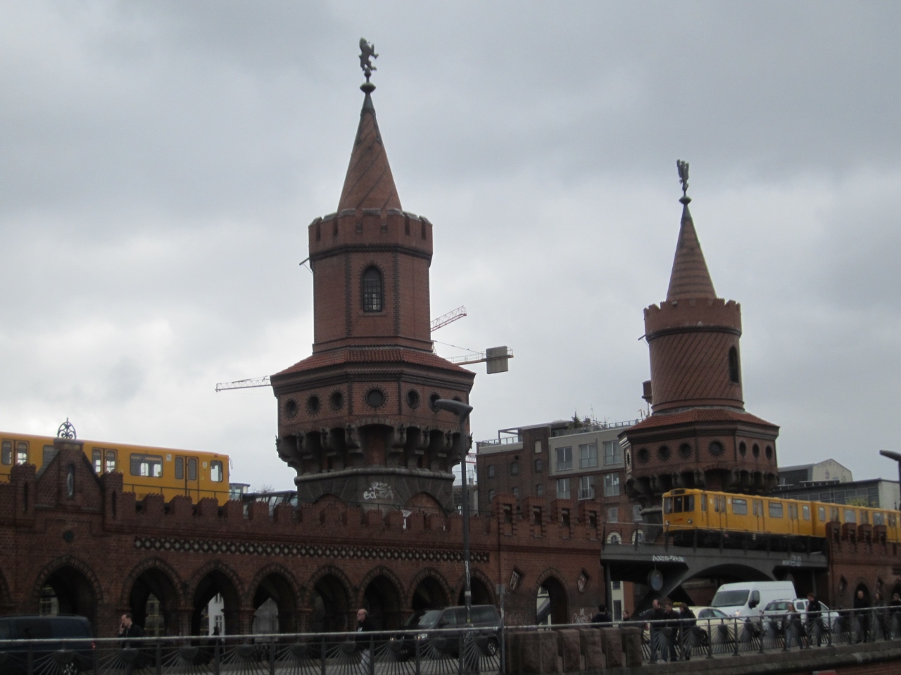シュプレー川にかかっている立派な橋です。イーストサイドギャラリーの見学とセットにして訪れました。橋の上はUバーンが走っています。人や自動車は通れません。人や自動車は下の道路を通ります。赤い色のレンガでできています。