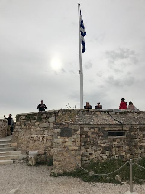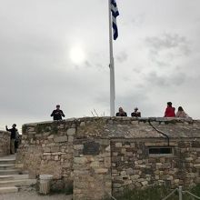 前門(プロピュライア)からパルテノン神殿がある広場に入って、一番奥にこのアクロポリス 展望台がありました。ギリシャ国旗がはためいているのですぐにわかると思います。展望台自体はそんなに高くありませんが、パルテノン神殿自体が高いところにあるので、アテネ市内が一望できます。